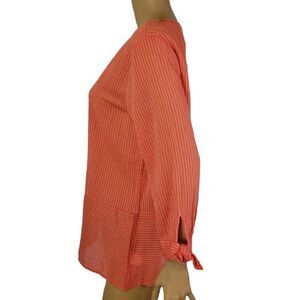 Orange red color, white vertical stripes pattern, slot collar, 3/4 sleeves, with a cute not a cuffs, 5-buttons, relalxed fit, lightweight, breathable and super comfortable. NWT