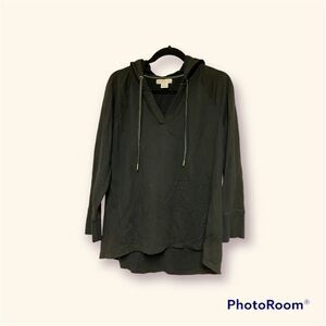 Hooded sweatshirt with drawstring around hood, drawstring has silver thread running through it. 100% cotton