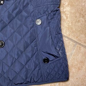 Liz Claiborne black quilted jacket. Collar and cuffs are accented with a blue, gray and black plaid design. Very nice. No tears or stains. Size M