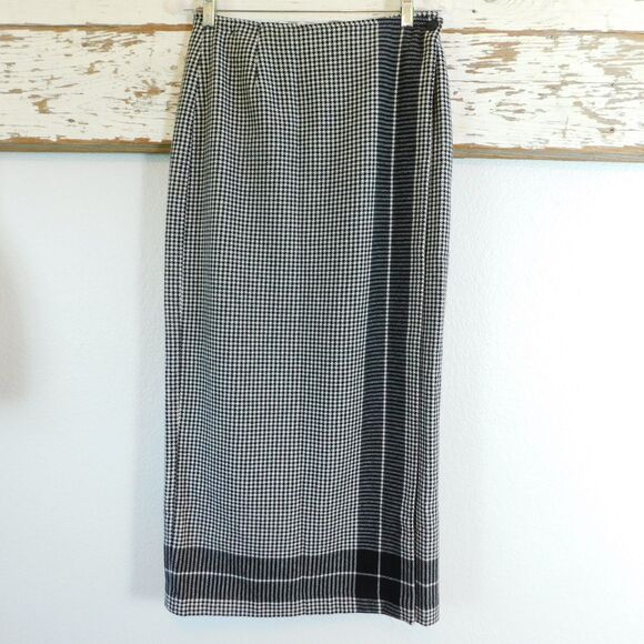 Liz Claiborne Lizsport Women's Size 10 Wool Blend Wrap Skirt, Black and White Houndstooth, Fully Lined, Maxi Length, Side Button Closure and Inner Button to keep it in place. Low wrinkle blend. Beautiful Condition!