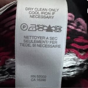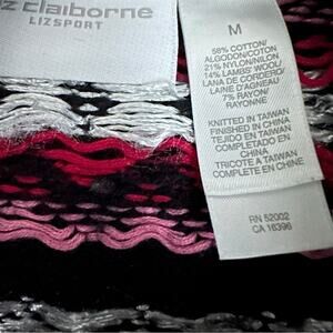 This cozy Liz Claiborne LIZSPORT sweater features a classic Fair Isle pattern in black, pink, and white. Crafted from a soft and warm lambswool blend, it is perfect for staying stylish and comfortable during chilly days.