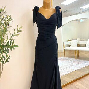 Cut from a luxe stretch jersey, this dress is artfully tucked and ruched to accentuate your curves and features an alluring off-the-shoulder neckline framed by elongated ties and a floor- pooling fishtail hem defined by a dramatic front slit so you can work the room with ease.