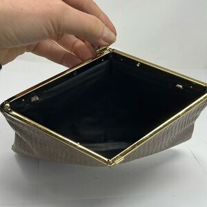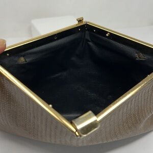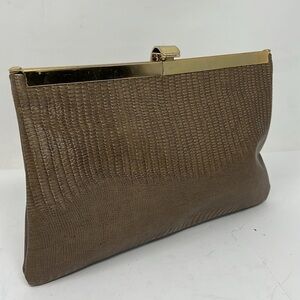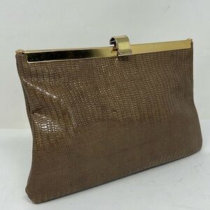 This is a great Lizard embossed vintage clutch bag. Good condition. There was strap with interior loops, the loops have been removed as has been the strap, so this is only carried as a clutch. Scratches on the brass frame. No odors. Interior has two holes where the interior loops were, otherwise excellent condition. 9.25” x 6.25”