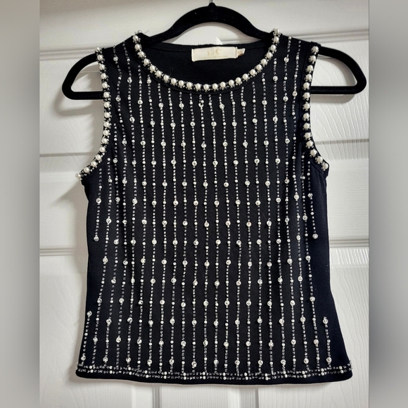 EUC - there is one pearl that is coming loose, picture included. This black fitted tank top showcases a striking vertical striped design made from pearls and Rhinestones, creating a unique texture. The round neckline is beautifully accented with embellishments, adding a touch of elegance. Ideal for a stylish casual outing, this top is a must-have addition to your wardrobe.