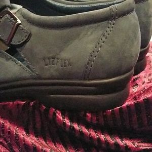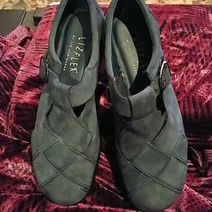 NWOT Lizflex very comfortable cute shoe. These shoes are actually a pretty dark blue slate suede. Features include a skid resistant and shock absorbing sole, a padded collar with a side buckle closure. These are a size 7M.