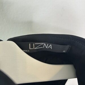 Unique blouse by Lizna. It features a graphic pattern in blue and black, a black collared neckline that buttons in the back, and a dramatic high low hem. Lined. Super versatile! All measurements are approximate, taken flat and closed.