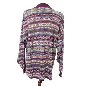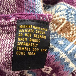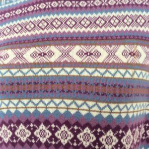 This beautifully patterned sweater is cotton but it is heavy and warm. It looks great with light blue jeans or leggings. It has drop shoulder long sleeves. It is in excellent pre-owned condition and has no flaws. The approximate measurements are very large for a medium: