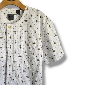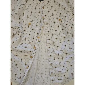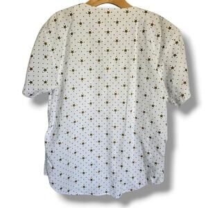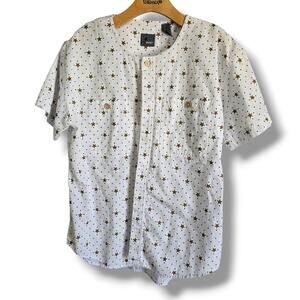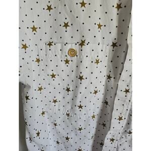 ✨ Cute and casual Lizwear star print button-down shirt. White with golden star + dot pattern, short sleeves, dual chest pockets. 100% cotton comfort. Pre-owned, great condition. Size Small, Approximate Measurements when laying flat 26" Length x 40" chest. Perfect for everyday wear or layering! 🌟