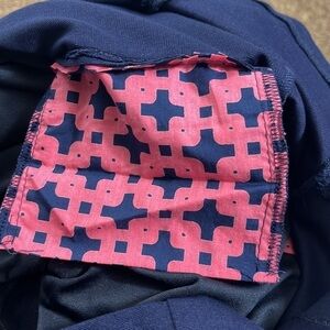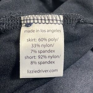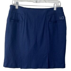 Lizzie Driver Skort Women's 4 Blue & Gray Colorblock Stretch Side Zip, very good condition, knit, 60 [p;u. 33 nylon, 8 spandex, two back vents, skirt + shorts underneath, decorative buttons, back pockets are still stitched closed, made in USA, activewear, golf, tennis, athleisure, mini, military