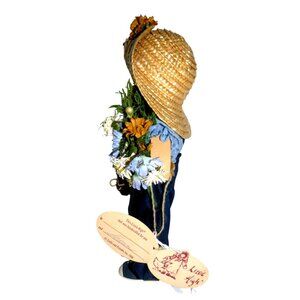 This quirky handcrafted doll, Maisie Bowman, brings charm with her rustic outfit and whimsical story. She's ready to share flowers—or just look cute.