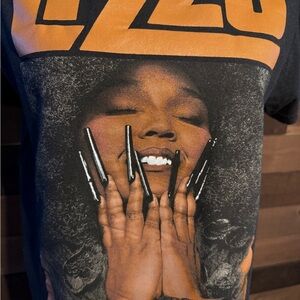 Stylish black t-shirt with bold orange graphic design. Features a striking image on the front.