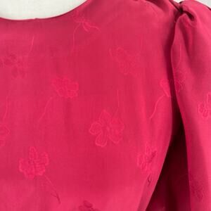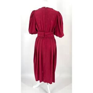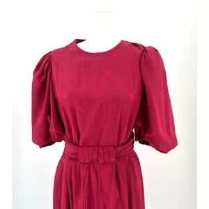 Features/Tags: 1980s, puff sleeves, slight shoulder padding, elastic waist with attached fabric belt, embossed floral pattern, faux wrap style skirt, midi length