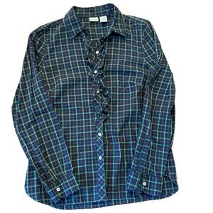 Lovely green and red plaid button down great for fall or holiday wear. Ruffle detail on chest. In great condition!