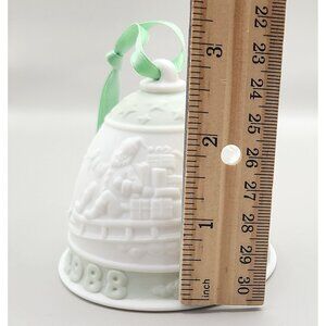Porcelain bell ornament featuring Santa and reindeer, dated 1988. Includes original box, certificate, and green ribbon for hanging.
