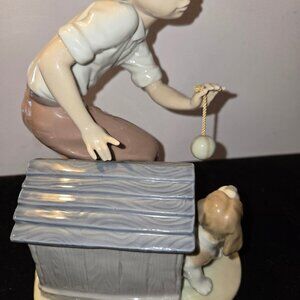 This porcelain figurine showcases a young boy playing with his dog, capturing a timeless and heartwarming moment. Ideal for collectors or display.