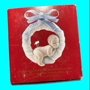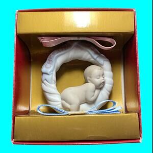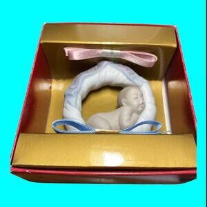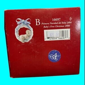 Lladro Christmas Ornament #16697, Year 2000 Baby’s First Christmas in the shape of a wreath or a baby's pacifier. It is handmade in Spain by Lladro artists. There's a little baby asleep on the wreath/pacifier. It is in the original box. I did not remove it from the box for the photos because it felt like it had never been out of the box. Both pink and blue ribbons are attached to the edges of the box. The original price tag of $65.00 is attached to the box. The box is not in mint condition but the ornament is. Please see photos for box condition.