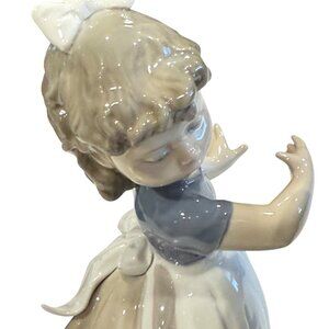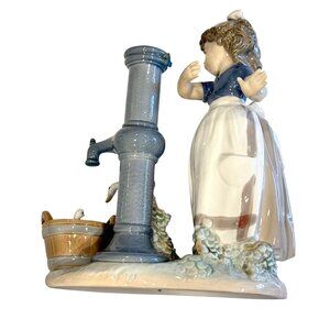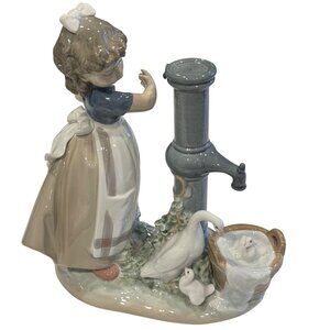 This delicate Lladro porcelain figurine depicts a serene countryside moment. A young girl stands by a water pump and a basket of water, interacting with a group of ducks. Beautifully crafted, it tells a story of simplicity, innocence, and connection to nature, making it a treasured piece of art.
