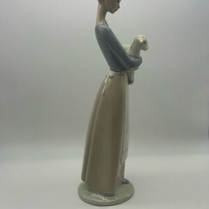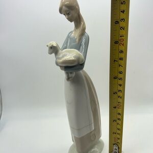 This beautiful Lladró figurine features a girl holding a lamb, handmade from glossy porcelain. The multicolor figurine is medium-sized, measuring 10.75 inches in height and 3.25 inches in width. It was manufactured in Spain between 1969 and 2001 and is an original piece, perfect for any room and occasion.