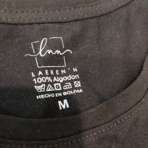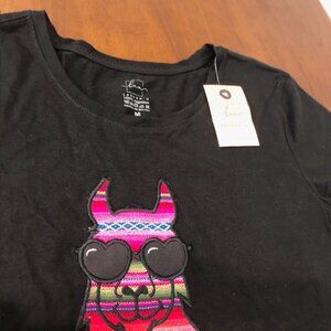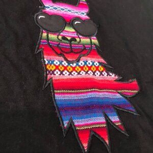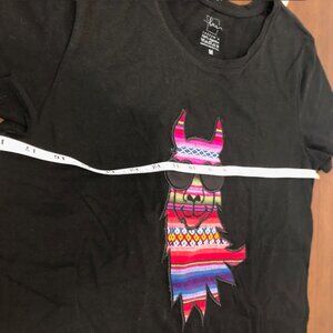 -Black. Short sleeve. Crew neck. Embroidered multicolor llama graphic print. Nicely made.