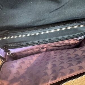 Black leather/nylon, interior is lavender nylon. Good condition.
