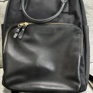 This is a size large lo and sons rowledge backpack with lilac interior and gold hardware. Condition is overall good. It has a small spot on the leather pocket. I bought it used and the foam in the strap appears to be coming apart and someone may have attempted to open the seam to fix it. It is still totally functional but would look better with professional repair.
