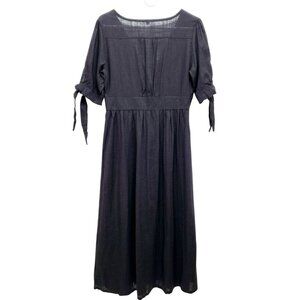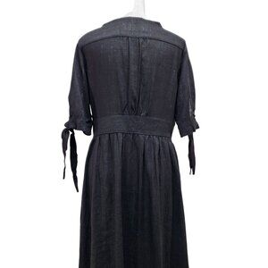 This black midi dress features a classic V-neck and button-front design, offering a blend of elegance and simplicity. Made with a breathable linen blend, it ensures comfort and style in professional or casual settings. The tie sleeves add a touch of sophistication to the overall aesthetic.