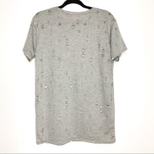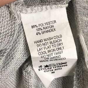 Size Medium. Fabric content is Polyester, Rayon and Spandex. See photos and feel free to zoom in to see the entire top front and back is distressed with tears, holes. Super cute heather gray color like a lightweight sweatshirt feel. Three dimensional embroidered rose motif design.