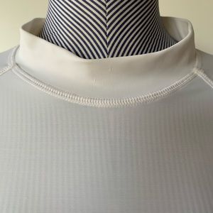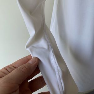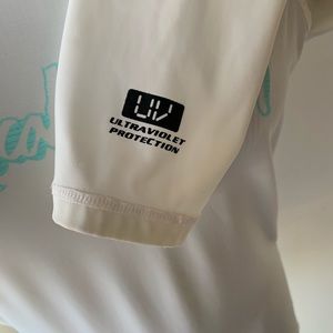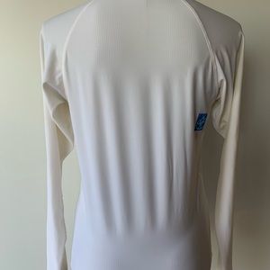 Long sleeved White Rash Guard, my guess is Women’s size Medium. Some staining and pulling on fabric but still functional. No holes or tears. See pics for close up.