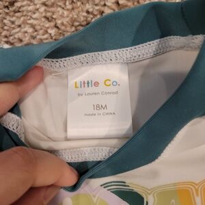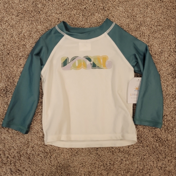 White and teal unisex rashguard with "local" icon in funky text. Text is teal, light purple, sage green, and warm yellow.