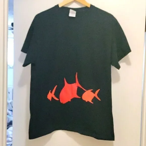 Black T-shirt with a very awesome screen printed fish designs on front. Great piece, no major flaws. See photos for details.