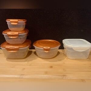 Preowned five pieces of Lock & Lock food storage containers. 3 rectangular, one round & one square. Ranging from 9 oz to 32 oz.