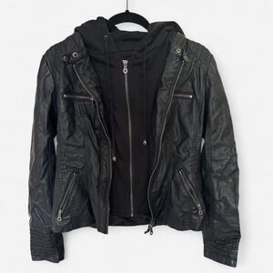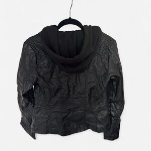 Lock and Love black leather zip-up jacket with removable cloth hood. Size small, good condition