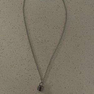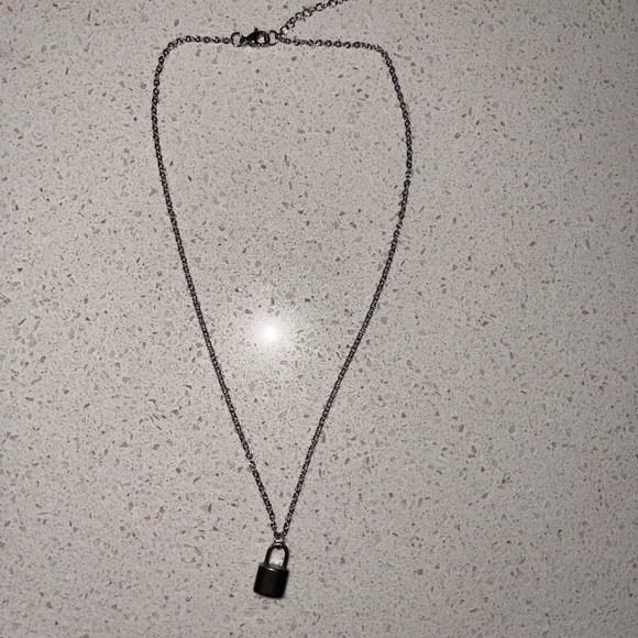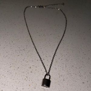 Silver lock necklace. Looser than a choker necklace, but is adjustable. Ships with the plastic bag it came in