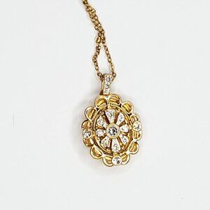 Locket Pendant Necklace Rhinestone Bling Goldtone Oval Scalloped Edge Hearts