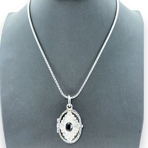 Locket Pendant with Black Faceted Cabochon Accent Silvertone Chain Necklace 21”
