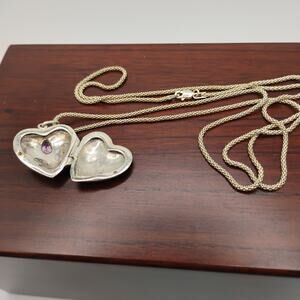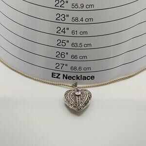 This product is a sterling silver necklace featuring a heart-shaped locket with marcasite and a pink cubic zirconia stone set in it. The locket is attached to a 28-inch Danecraft chain, making it a stylish and elegant piece of jewelry. The combination of silver and pink in the design adds a touch of femininity to the overall look, making it a versatile accessory that can be worn for both casual and formal occasions.