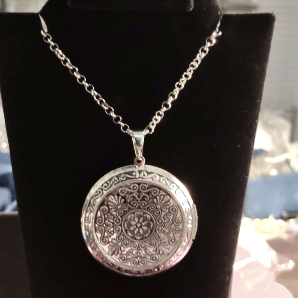 Silver Tone Floral Engraved locket with chain 28-in great way for a loved one to keep your picture close to them or you can keep them close to you. It comes from the heart. enjoy ❤️