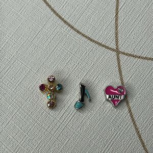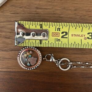 Origami owl style locket necklace. Stunning locket with rhinestones in Rose gold color. This locket contains charms of a heart that says “aunt”, a cross and a high heeled shoe. Chain with lobster claw measures approximately 27 inches. Item is in excellent used condition with a few minor scratches on the back of the locket.
