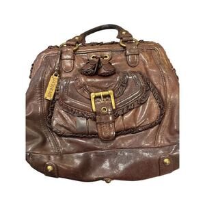 Keywords: Lockhart, leather bag, satchel, top handle, brown bag, fringe pattern, vintage, Victorian theme, romantic style, casual bag, women's handbag, multicolor lining, brass hardware, pre-owned, good condition.