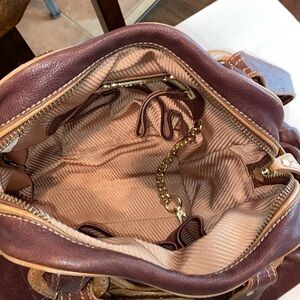 Beautiful mocha and tan pebbled leather. Great big shoulder bag for all the essentials. Stone front detail. Bag has 4 outside pockets (1 front, 1 back, and on each side). Inside has large open space with 1 zippered pocket and 5 open pockets. Interior has minor marks, see pic for inside zip pocket stain. Minor wear to handle top edge and inner fabric. Please see photos.