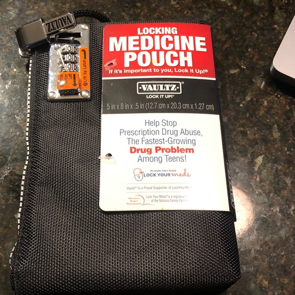 Black zippered pouch with combination lock. Great for storing medicine, jewelry, cash or other valuables. Combination lock instructions included. Measures 5” x 8”