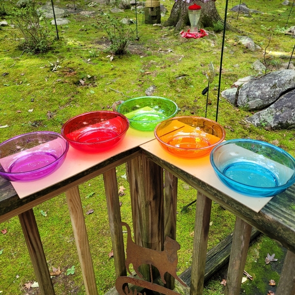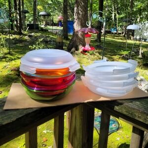 NWOT. Set of 5 stackable Tritan bowls with domed lids. Each holds 4 cups. You get one of each color: Violet, Red, Lime, Tangerine, and Aqua. "Tritan is made from the same material as airplane windshields. Stain proof. Microwave safe - remove lid and flip it over. Dishwasher safe. Freezer safe."