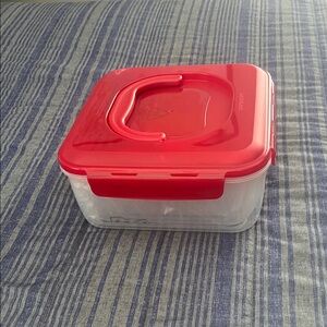 Keep your food fresh with this stylish red and clear food storage container. Perfect for organizing your kitchen essentials.