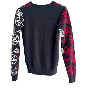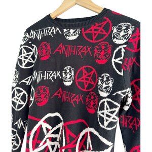 Locoape or Loco Ape men's Anthrax sweater. Sweater is a black crew neck and it features red and white pentagrams, faces and spell outs. Sweater is made of 100% acrylic and is a man's size small.