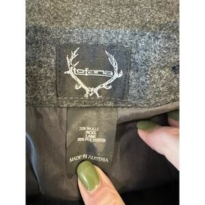 Beautiful vintage-style Austrian wool skirt by Lodenfrey (Loferna), made in Austria. Crafted from a soft, warm wool blend in classic charcoal gray with dark green trim and intricate button accents at the waist. Fully lined with a smooth viscose interior for comfort. Traditional European tailoring and quality craftsmanship.