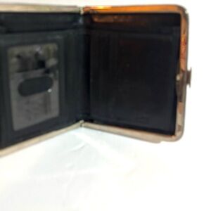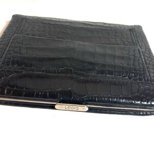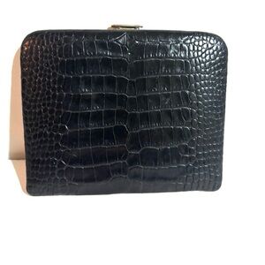 Elegant black crocodile embossed clutch. Perfect for evening outings. 2 cash slots 6 cards slots snap pocket at front inside corner have minor tear hight 4.5” wide 5.25”Hi, some of the items are being sold twice as much as I don’t wanna cancel. I don’t have a choice so I don’t know if the mistake is on my end. Is there a way you can look into that? I don’t even know if it’s possible thanks.