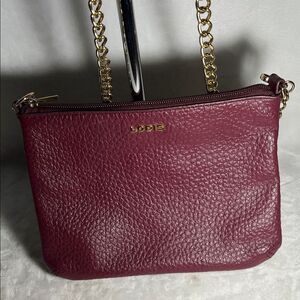 Elegant Lodis crossbody bag in wine. Features a stylish gold chain strap with leather shorter strap. Can be converted in a wristlet, shoulder bag crossbody, clutch. see pic for details and measurements.