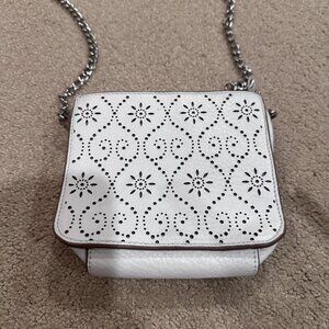 Lodis White Small Laser Cut Clutch with Removable Crossbody Silver Chain and Leather Strap. Magnetic Closure with Outside Pocket. Built-in Mirror Inside the Purse.