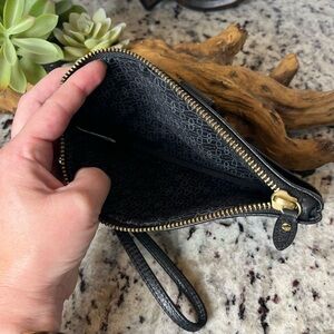 This stylish black leather wristlet is perfect for any occasion. Its sleek design and high-quality material make it a must-have accessory.