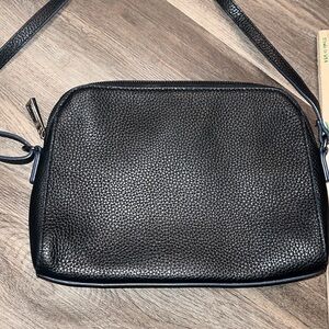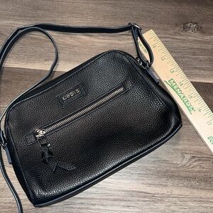14” inch strap drop other measurements in pictures. Color is a deep Navy Blue pebbled textured crossbody bag. Smoke and pet free home. One outside zip compartment and one open internal pocket. Exterior is leather. See all pictures for condition. Hardware is silver